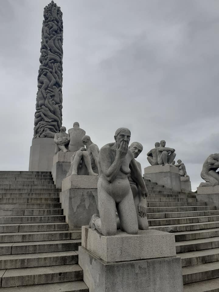 We climbed the slanted roof of the public library. We used our Oslo travel app to take a bus out to Vigelandsparken – a park designed by Norway’s most famous sculptor, Gustav Vigeland, and containing hundreds of his pieces. This was quite an astonishing place – such a volume of one artist’s work. I was slightly ashamed to have never heard of him before.
