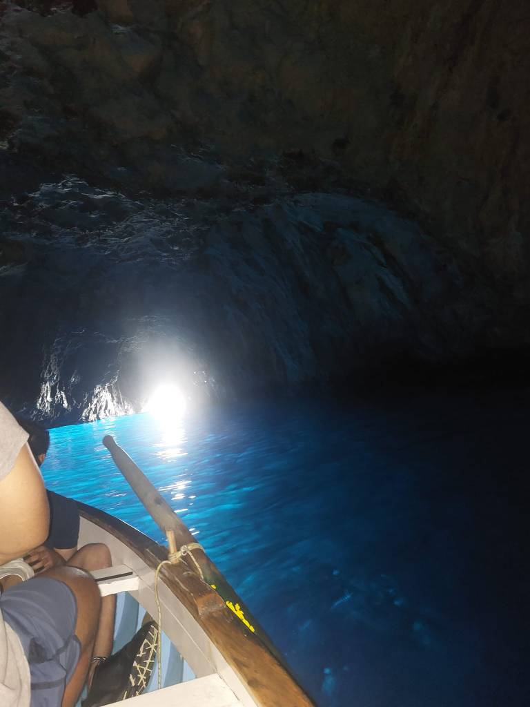 Monday was a day for sailing. Our apartment was located a few minutes-walk to the ferry. We’d decided to go glamourous on our final full day and take a ferry to the island of Capri. We disembarked the boat and wondered aloud what to do. It was 1pm. Our return ferry was at 8.20. Perhaps a little preplanning would have been wise. All the vendors were hawking a boat-trip to the Blue Grotto and around the island so that is what we selected. The Blue Grotto is a cavern in a rock – a narrow entrance on small sail-boat reveals a grand chamber where the water is sky blue thanks to the sunlight entering from the cave entrance. Our portly guide claimed to be Pavarotti’s brother. They must have some amazing mother – Luciano would be nearly 90 if he was alive. Our sailor was about 30. He serenaded us to Nessun Dorma in the cave. It was strangely moving.